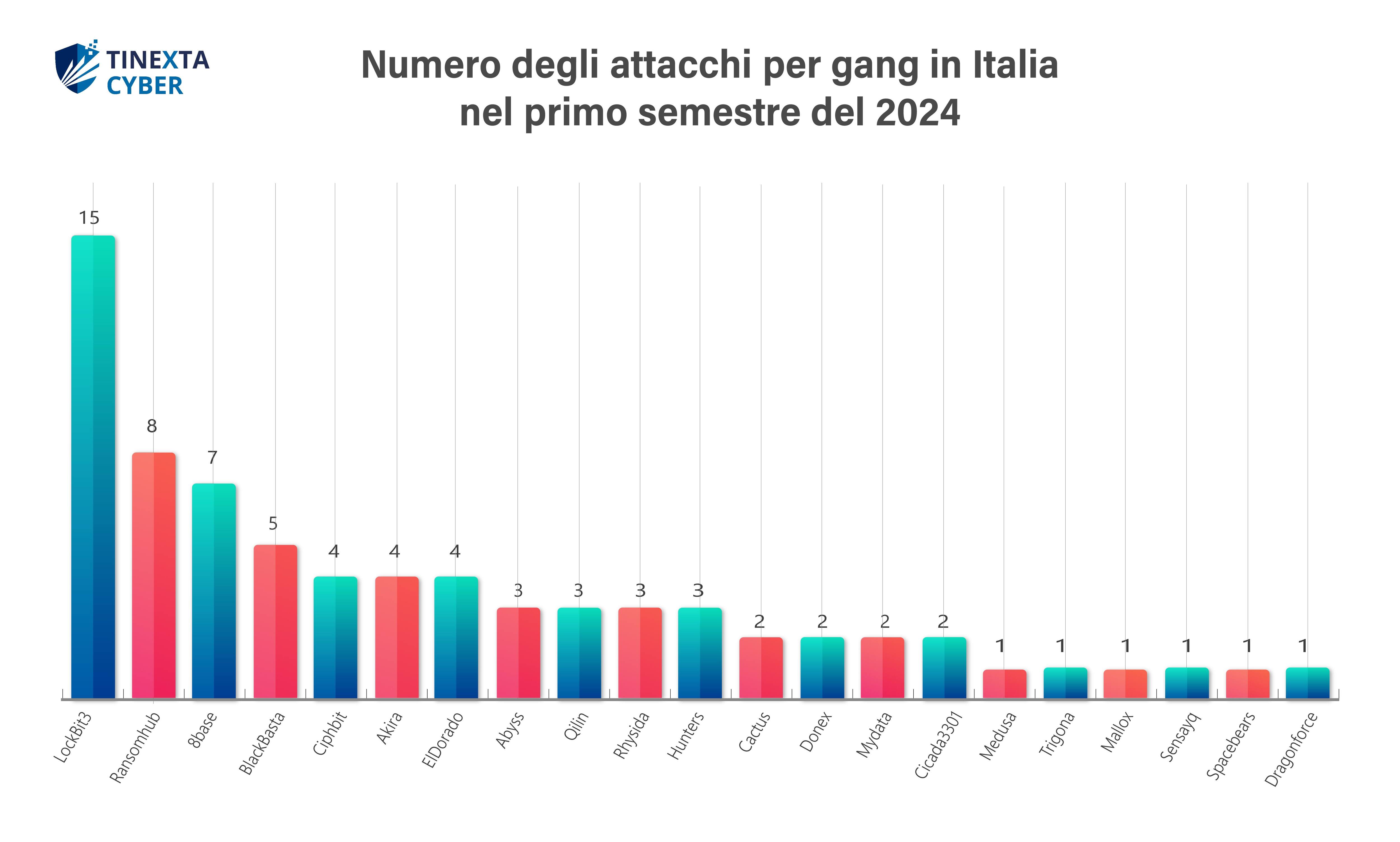 Secondo il “Risk Report 2024” stilato da Tinexta Cyber, il numero di furti di dati sensibili con richiesta di riscatto quest'anno è salito del 5,3% a livello globale, evidenziando una maggiore diffusione geografica delle minacce. Da 91 Paesi colpiti si è passati a 99. Stando al rapporto, il numero delle “gang” attive che effettuano attacchi informatici è aumentato del 40,4%, passando da 52 a 73