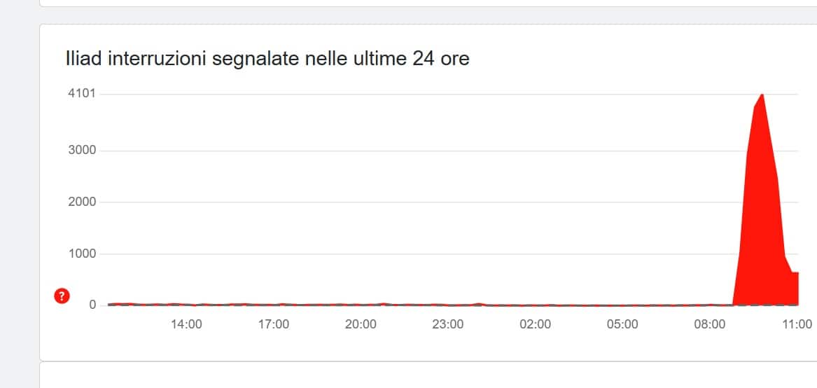 Disservizi oggi sulla rete Iliad, con rallentamenti nella rete Internet e interruzioni anche nei servizi di chiamata. Diverse segnalazioni sono infatti arrivate questa mattina da parte degli utenti. Il sito web Downdetector ha rilevato una crescita delle segnalazioni di guasti dalle ore 8.45, fino alle 4.000 in un'ora.
