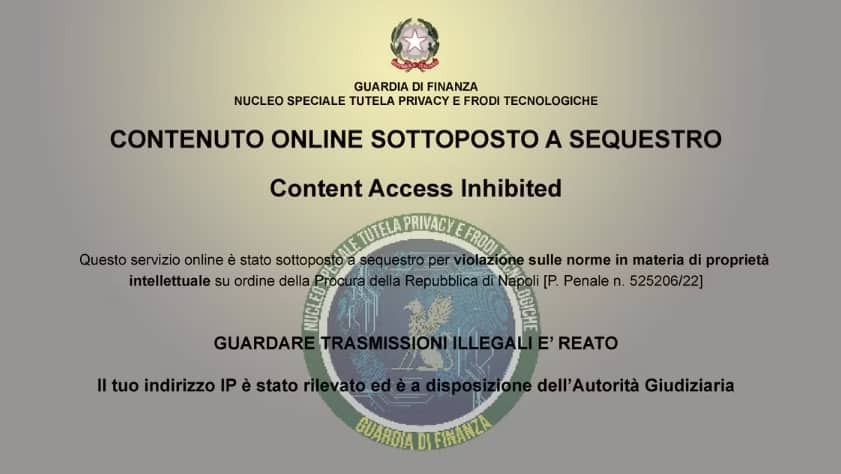 “Non si tratta più di blocchi saltuari: ora il mirino è puntato su di noi”, dicono i criminali che gestiscono la pagina sui loro canali. Chi cerca di accedere viene indirizzato su un messaggio della Guardia di Finanza che ricorda come guardare trasmissioni illegali sia un reato e che gli indirizzi ip degli utenti pirata sono stati rilevati e sono “a disposizione dell’Autorità giudiziaria”