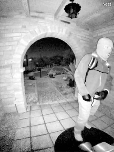 Le immagini di una telecamera Nest installata sulla porta d'ingresso di Nancy Guthrie, scattate la notte della sua scomparsa, sono state pubblicate dall'FBI. Si vede un individuo indossare un passamontagna e dei guanti fuori dall'abitazione di Guthrie (IPA)