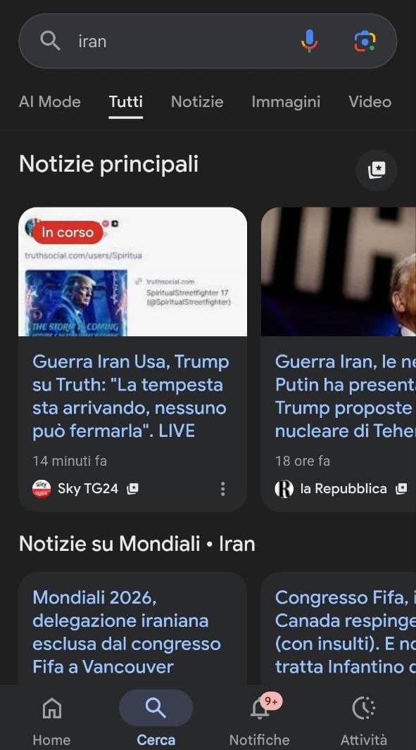 Per prima cosa, si effettua una ricerca legata a un argomento o a una notizia nella barra di ricerca (in questo caso selezioniamo “Iran”), poi si clicca sull'icona che appare accanto alla scritta “Notizie principali”: