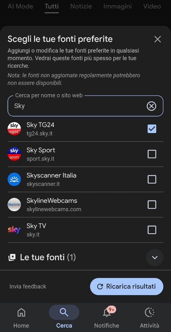 Successivamente apparirà una finestra che consente di selezionare le proprie fonti preferite. Qui, si cerca “Sky TG24” e si spunta la casella relativa al sito della testata: