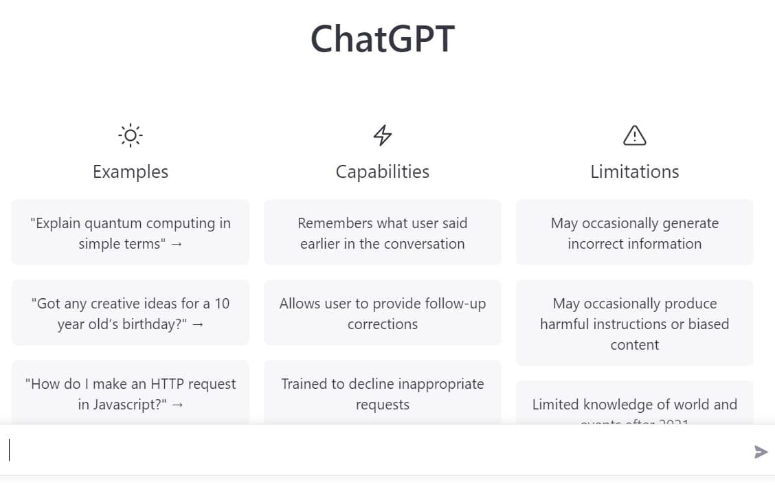 ChatGPT è una chat testuale creata dalla società OpenAI che può conversare e interagire con gli utenti, imparando ed evolvendosi giorno dopo giorno attraverso le conversazioni. Utilizza una tecnologia di apprendimento automatico chiamata Transformer che gli consente di capire il contesto del testo e generare risposte appropriate. Viene utilizzato per automatizzare molti compiti di scrittura e creare contenuti in modo rapido, come riassumere un testo, comporre una tesina, creare una filastrocca, dare consigli su una strategia di marketing, spiegare teorie filosofiche complesse. Viene presentato come una pagina vuota e un campo di testo in cui poter scrivere quello che si vuole