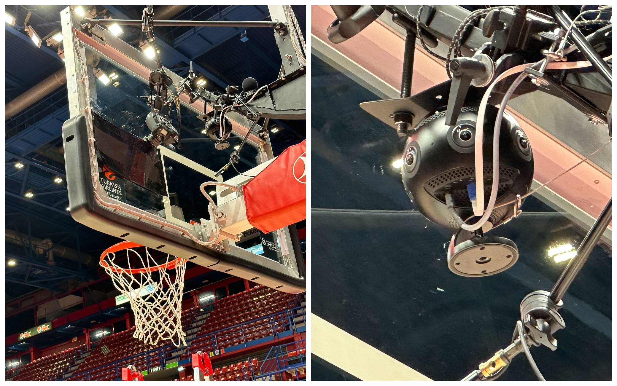 Durante una nostra visita esclusiva al Mediolanum Forum, prima del match dell’Olimpia Milano contro il Bayern Monaco, abbiamo potuto osservare il posizionamento delle telecamere, che hanno la caratteristica di alimentarsi da sole tramite delle batterie e di non dover essere collegate attraverso cavi, come invece avviene con le normali apparecchiature televisive, con la possibilità di poter essere dunque spostate in qualsiasi posto in qualsiasi momento. L’idea, ci spiegano, era proprio quella di non cablare le telecamere in posizioni “canoniche” e di sperimentare la possibilità di lavorare in maniera “libera” e allo stesso tempo con un’alta capacità di trasmissione dati. Noi stessi abbiamo provato l’esperienza dal vivo utilizzando un visore Oculus Quest (ma volendo si potrà accedere anche con un normale smartphone o con altri sistemi) e siamo stati catapultati immediatamente all’interno del palazzetto, in un’esperienza di visione totalmente nuova: una volta avuto accesso al sito dove viene trasmessa la partita in modalità 360 è possibile scegliere il proprio punto di vista girando la testa in qualunque angolazione e osservando, ad esempio, il comportamento del pubblico, i movimenti dell’allenatore e della panchina, addirittura si può seguire tutta un’azione come se la nostra poltrona fosse posizionata sopra il canestro e guardare in basso “atterrare” i giocatori dopo aver segnato un punto.