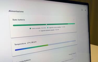 Altro pezzo forte di questo laptop, a nostro avviso, è la batteria a quattro celle di polimeri di litio da 70Whr. Ha la ricarica rapida (adattatore da 65W presente in confezione) e nei nostri test ci ha dato molta soddisfazione permettendoci di lavorare da mattina a sera, anche nelle giornate più impegnative con tante riunioni ed elaborazione foto e video, senza dover collegare la spina. Merito anche del modo intelligente in cui prestazioni e potenza vengono bilanciate dal processore e dal software, in base all’attività svolta. Completano la configurazione quattro altoparlanti da 2W compatibili con il Dolby Atmos e 4 microfoni (nulla da segnalare, funzionano molto bene anche lavorando in un luogo affollato come un bar).