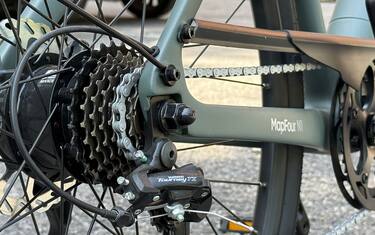 Per quanto riguarda la batteria troviamo un modello Samsung rimovibile da 360 Wh. Per ricaricarla (ci vogliono dalle 5 alle 8 ore) è possibile collegare l’alimentatore direttamente alla bicicletta oppure - utilissimo - rimuovere la batteria e portarla in casa, operazione velocissima che si effettua girando una chiave di sicurezza. ENGWE assicura che con una carica è possibile pedalare per una settimana e parla di circa 100 km di autonomia con assistenza di livello 1: si tratta di una durata eccezionale considerato che spesso, in piano o in discesa, l’assistenza elettrica può essere disattivata, andando così a risparmiare ulteriormente batteria.