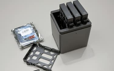 Il NAS è un cubotto di colore grigio discreto ma allo stesso tempo elegante: sta bene anche su una scrivania e su un arredamento sia moderno sia classico. Sul lato anteriore troviamo, oltre al tasto di accensione, il led per il collegamento alla Ram, quello relativo ai quattro dischi, una porta USB-C 3.2 (che assicura trasferimenti fino a 5 Gbps). Nella parte superiore anche un’area di riconoscimento NFC (basta avvicinare uno smartphone compatibile al NAS e la connessione è immediata - ovviamente bisognerà poi inserire il proprio username e la propria password per accedere ai file). Nella parte posteriore, invece, troviamo una porta HDMI (che permette di riprodurre video, se collegato a una tv o a un monitor, fino alla risoluzione 4K, due porte USB 3.2, una porta Lan 2.5 GbE (offre velocità di trasferimento fino a 312,5 MB/s) a cui va collegato il cavo Ethernet per il collegamento al modem. Per installare i dischi basta alzare la parte superiore (come se avessimo davanti a noi una scatola) che però non è bloccata, e così se qualcuno dovesse inavvertitamente sollevare il NAS dalla parte superiore rischierebbe di farlo cadere: sarebbe stato più opportuno inserire un pulsante di sblocco. Nella confezione, infine, troviamo oltre ai cavi classici un cacciavite e le vitine per l’installazione dei dischi che, ovviamente, vanno acquistati a parte. La configurazione SATA a quattro alloggiamenti supporta fino a 120 TB di capacità totale (30 per ogni unità).