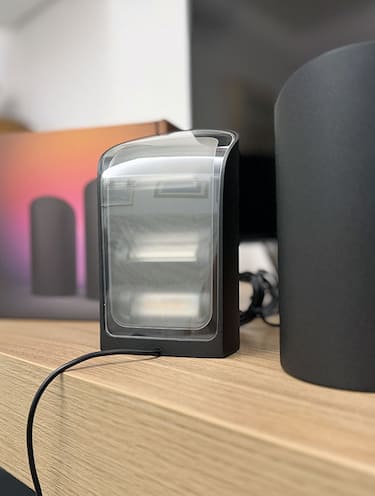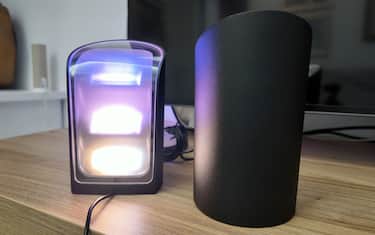 Nella confezione troviamo la lampada (o le lampade, se scegliamo il pack da due) e l’alimentatore, che permette di collegare tre dispositivi. Noi, avendo due lampade, le abbiamo collegate entrambe insieme all’Hue HDMI Sync Box (vedi dopo): ottima idea per risparmiare spazio. Per attivare le luci l'unica cosa da fare è il collegamento all’app di Philips Hue per tutta la gestione e per la connessione agli ecosistemi di smart home. Molto elegante il design in alluminio con finitura opaca. Le luci sono compatte (circa 16x9 centimetri per un peso di circa un kilo e mezzo) e sono facilmente integrabili sia in stanze con arredamento moderno che classico.