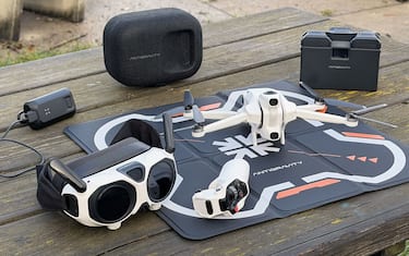 Ma entriamo nel cuore della nostra recensione iniziando a parlare di cosa troviamo nella confezione: oltre al drone (comodo da trasportare, che si ripiega su se stesso) gli elementi fondamentali dell’esperienza di Antigravity A1 sono un visore (Vision Goggles) e un controller (chiamato Grip). Questa accoppiata, grazie alla modalità FreeMotion, rende intuitivo il volo: il controller è in fatto in grado di tradurre i movimenti delle mani in traiettorie di volo, consentendo si cambiare rotta semplicemente muovendo le braccia, in una sorta di volo “point-to-fly”. Essendo dotato di visore, Antigravity A1 permette comunque anche la modalità di volo classica FPV già vista su altri modelli. Il visore è alimentato da una batteria che si tiene appesa al collo (non pesa nulla) e sono utilizzabili anche da chi - come il sottoscritto - porta gli occhiali: è possibile infatti modificare la gradazione e la distanza interpupillare in modo molto semplice ed è utilizzabile dalla maggior parte delle persone con difetti della vista anche medio-alti (da +200° a -500°). Al suo interno il visore integra ottiche Pancake e doppi display Micro-OLED da 1 pollice. La cosa “geniale” di questi schermi esterni è che mentre il drone vola amici o colleghi possono visualizzare nella parte frontale degli occhiali quello che il drone sta inquadrando, dando così a tutti la possibilità di immergersi nel volo, anche ai non esperti.