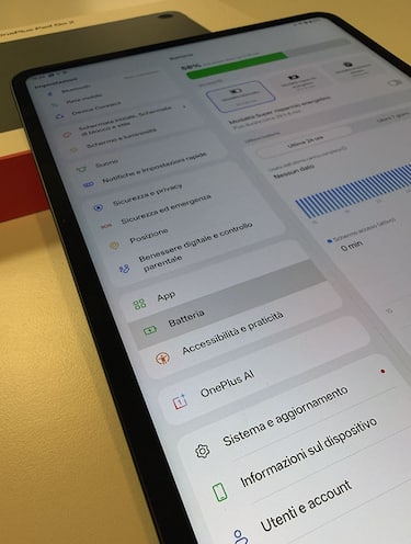 Il sistema è gestito da un chip octa-core MediaTek Dimensity 7300-Ultra: garantisce prestazioni molto buone e nella maggior parte dei casi molto fluide. A livello di memoria troviamo 8 gigabyte di Ram e 128 o 256 gigabyte di spazio di archiviazione. Disponibile, sulla versione nera, per la prima volta anche l’opzione con slot per la sim 5G, per rimanere connessi anche dove non c’è il Wi-Fi; manca invece la funzionalità eSIM. Parliamo ora della batteria, che è potente e ben equilibrata: ben 10.050 mAh con supporto alla ricarica rapida SUPERVOOC da 33 W (alimentatore non presente in confezione). Durante le nostre prove l’abbiamo usato saltuariamente per diversi giorni senza dover mai ricaricare per oltre una settimana; sotto pressione permette di lavorare oltre un giorno senza mettere mano ai cavi. E a proposito di cavi: il sistema supporta la ricarica inversa e permette di ricaricare uno smartphone in caso di emergenza.