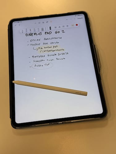OnePlus Pad Go 2, spiegano da OnePlus, è il primo modello della serie OnePlus Pad Go a supportare una stilo. La Stylo proposta da OnePlus si acquista a parte al prezzo di 79 euro e permette di prendere note, firmare documenti, disegnare, colorare. Si ricarica in maniera veloce tramite USB-C, supporta ben 4.096 livelli di pressione ma non ha un aggancio magnetico come accade su altri modelli e altri marchi. In tutta onestà non siamo rimasti particolarmente colpiti dalla sensazione di scrittura, soprattutto a causa di un po’ di latenza (cioè il tempo che passa da quando facciamo un tratto a quando questo viene visualizzato sul display).