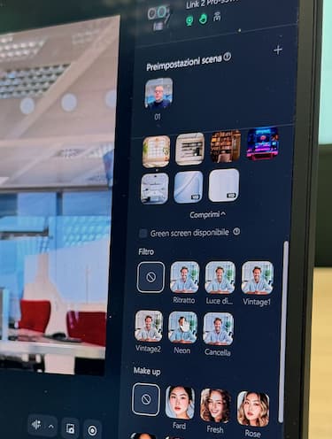 Tantissimi, dicevamo, gli effetti che è possibile applicare alla nostra immagine, dagli sfondi virtuali alla sfocatura. Utilissimo poter salvare le personalizzazioni alla propria immagine in un preset di inquadratura ed effetti: uno adatto ad esempio alla scrivania dell’ufficio, un altro a quella di casa. Possibile anche migliorare i toni della pelle o applicare un po’ di trucco, per rendere migliore la propria immagine trasmessa. Da notare che questi effetti vengono gestiti meglio da pc recenti e più potenti: con pc più datati (abbiamo fatto diverse prove) abbiamo notato che la batteria (del pc) tende a scaricarsi molto velocemente e abbiamo notato anche dei rallentamenti e dei peggioramenti della resa video.
