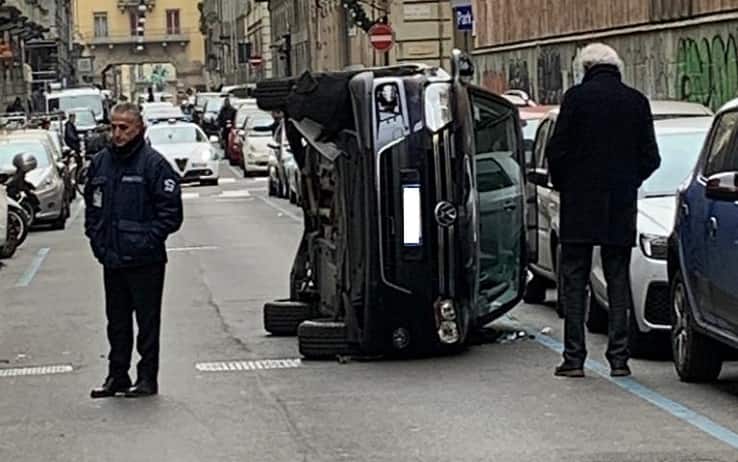 Incidente stradale nel centro di Torino, in via Bogino, vicino all'ingresso del Circolo dei Lettori. Un'auto si è ribaltata sul fianco dopo aver urtato le vetture parcheggiate. L'uomo al volante è uscito dal tettuccio dell'auto con l'aiuto di altre persone, illeso. Sul posto sono intervenuti i vigili urbani per effettuare gli accertamenti sulla dinamica dell'incidente.
