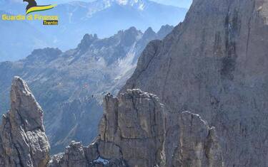(ANSA) - TRENTO, 28 SET - I Finanzieri della Stazione S.A.G.F. di Passo Rolle (Trento), congiuntamente alla Sezione Aerea di Bolzano della Guardia di Finanza, durante un volo di ricognizione terrestre lungo la zona di confine tra le provincie di Bolzano e Trento, hanno individuato quattro persone intente nell'affrontare una slackline montata tra le torri del Vajolet.
