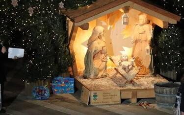 Il presepe, in legno di cirmolo proveniente da boschi della Val di Non, è stato scolpito dall'artista trentino Livio Recla e rappresenta la Sacra Famiglia. La capanna costruita da alcuni cittadini volontari, si ispira alle antiche baite montane del Trentino e riporta al centro un grande fiocco di neve, simbolo dell'acqua e della vita che germoglia. (ANSA).