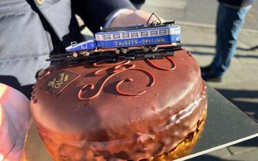 (ANSA) - TRIESTE, 01 FEB - Una torta Sacher con un tram di Opicina in miniatura al posto di topper e candeline. E' con un'iniziativa goliardica che un gruppetto di persone ha festeggiato, oggi a piazza Oberdan a Trieste, la ripartenza 'fantasma' del tram dal suo storico capolinea.