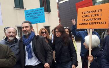 (ANSA) - VENEZIA, 13 NOV - Un presidio davanti alla sede del tribunale di Venezia, in piazzale Roma, si è svolto stamani, organizzato dal Sindacato e dall'Ordine dei Giornalisti del Veneto nell'ambito della giornata "Giù le mani dall'informazione", organizzata a difesa della categoria.