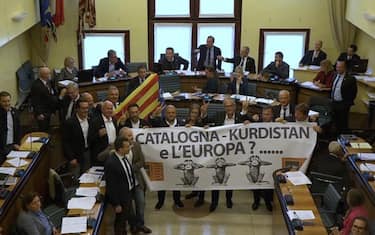 (ANSA) - VENEZIA, 15 OTT - I consiglieri regionali della Lega e di Zaia Presidente, insieme ad alcuni assessori regionali, hanno manifestato questo pomeriggio in aula a palazzo Ferro Fini, sede veneziana del consiglio regionale, a favore della Catalogna. Durante la sospensione dei lavori, concessa per alcuni minuti dal presidente Roberto Ciambetti, i consiglieri del Carroccio hanno srotolato uno striscione con la scritta Catalogna-Kurdistan e l'Europa?...." e sventolato la bandiera della Catalogna.