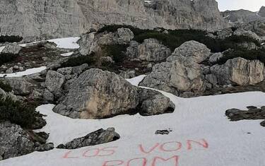 (ANSA) - CORTINA D'AMPEZZO, 09 MAG - Una scritta "Los von Rom" (Via da Roma) è apparsa oggi sulla neve del passo di Valparola, a Cortina d'Ampezzo, al confine con la vicina Val Badia.