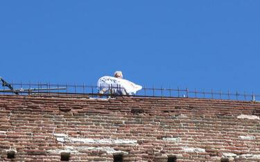 (ANSA) - VERONA, 19 SET - Flash-mob di protesta oggi di Giorgio Pasetto, candidato capolista al Senato nel collegio plurinominale Veneto 02 per +Europa, che si è affacciato dalla sommità dell'Arena di Verona con uno striscione "Cannabis libera".