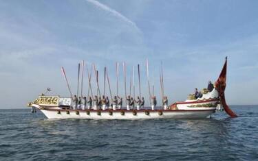 L'imbarcazione a remi, condotta da 18 vogatori e un timoniere, chiamati a raccolta da Rudi Vignotto tra i campioni di ieri e di oggi della Regata Storica, è partita dalla remiera Pellestrina, dove era arrivata dopo il varo dei giorni scorsi con la collaborazione dell'Ufficio Regate comunale.