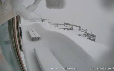 (ANSA) - BELLUNO, 29 NOV - Un'altra giornata con freddo e neve ventata quella odierna sulla Marmolada, che in queste settimane ha ripreso l'aspetto del meraviglioso massiccio bianco per il quale è conosciuta. Un nuovo impulso perturbato ha portato altri 10 centimetri di neve fresca a Punta Penia, la vetta della montagna, 3.343 metri di quota, con temperatura che è scesa fino a -11 gradi. Le immagini delle webcam della rete 'marmoladameteo.it' mostrano il rifugio Capanna Punta Penia con un muro di neve davanti, frutto degli accumuli portati dal vento negli ultimi giorni. (ANSA).